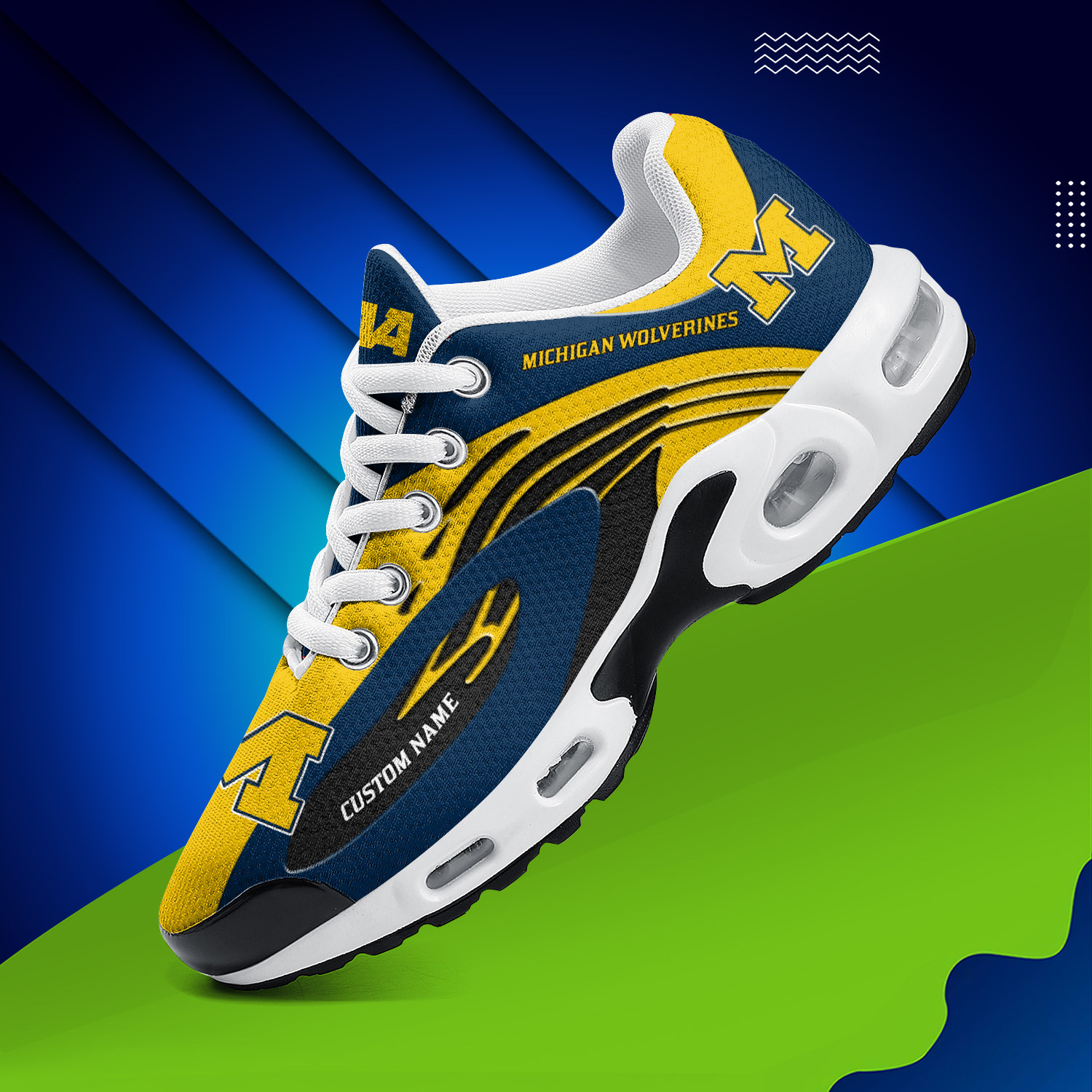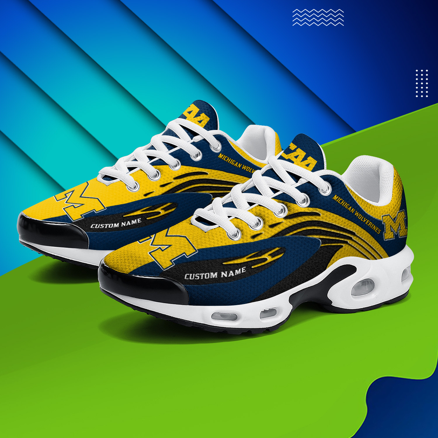 Michigan Wolverines Personalized Name Team Logo Mix Colors Wave Line TN Air Max Shoes Air Cushion Sneakers