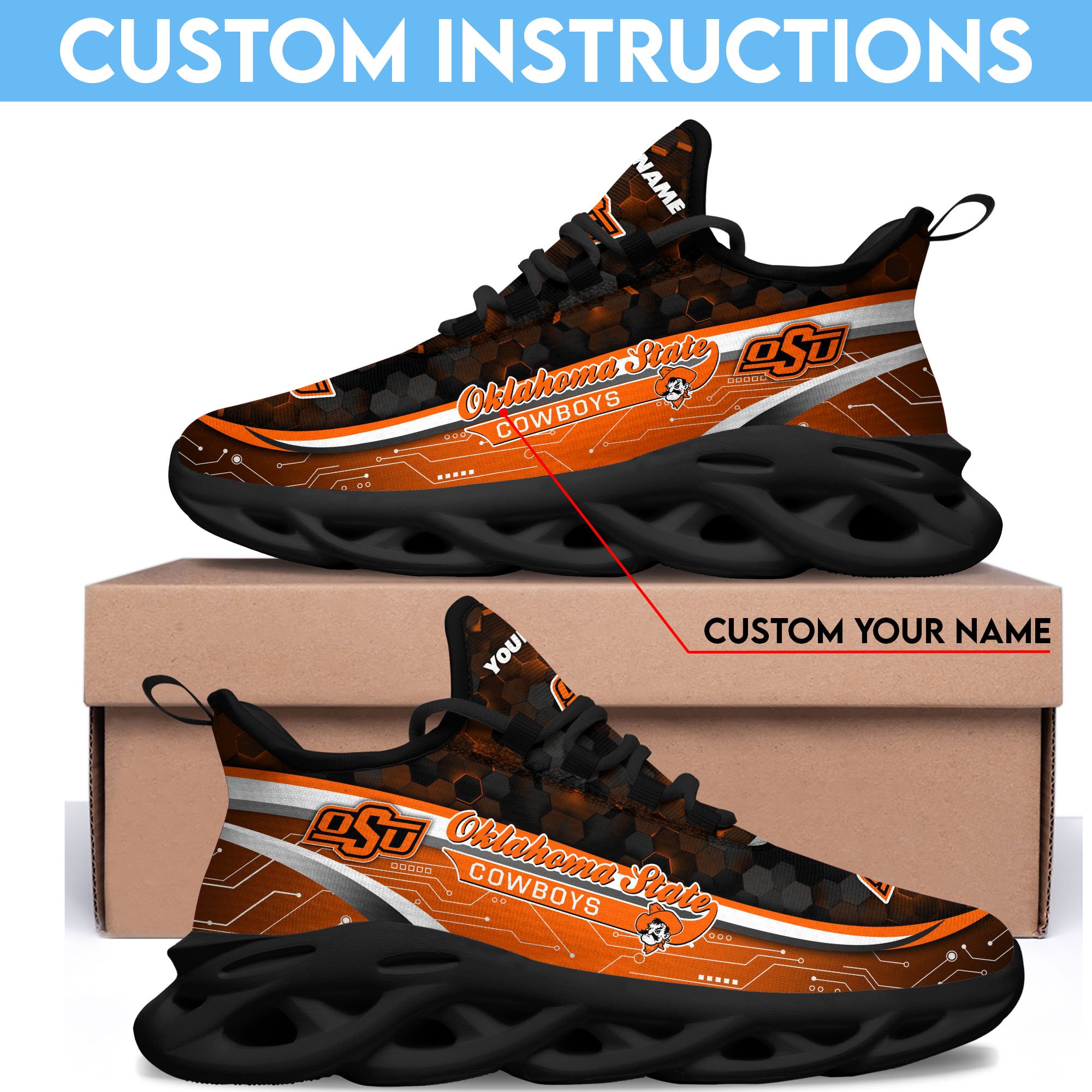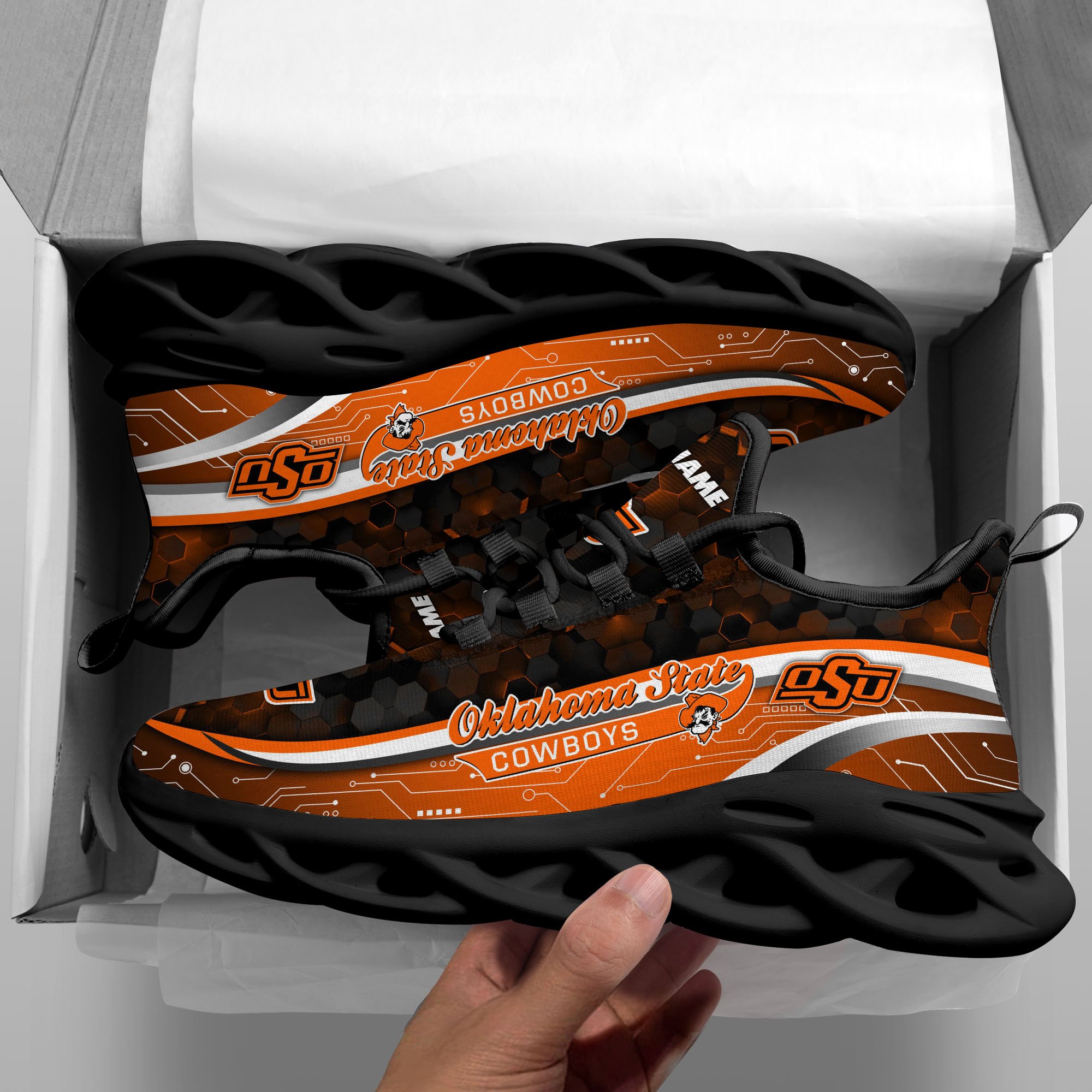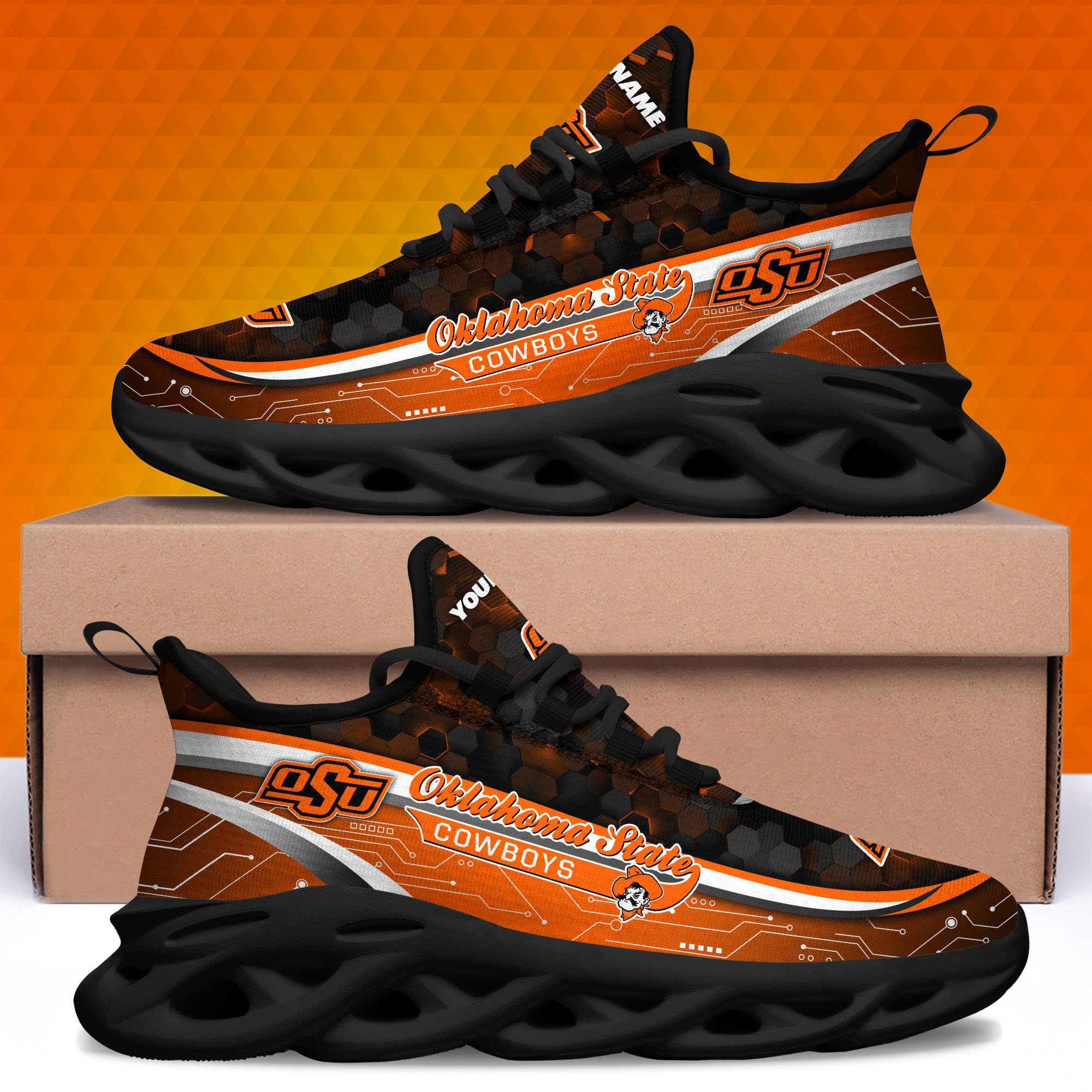 Oklahoma State Cowboys Black Clunky Sneakers Custom Name, Max Soul Shoes, Sport Gifts