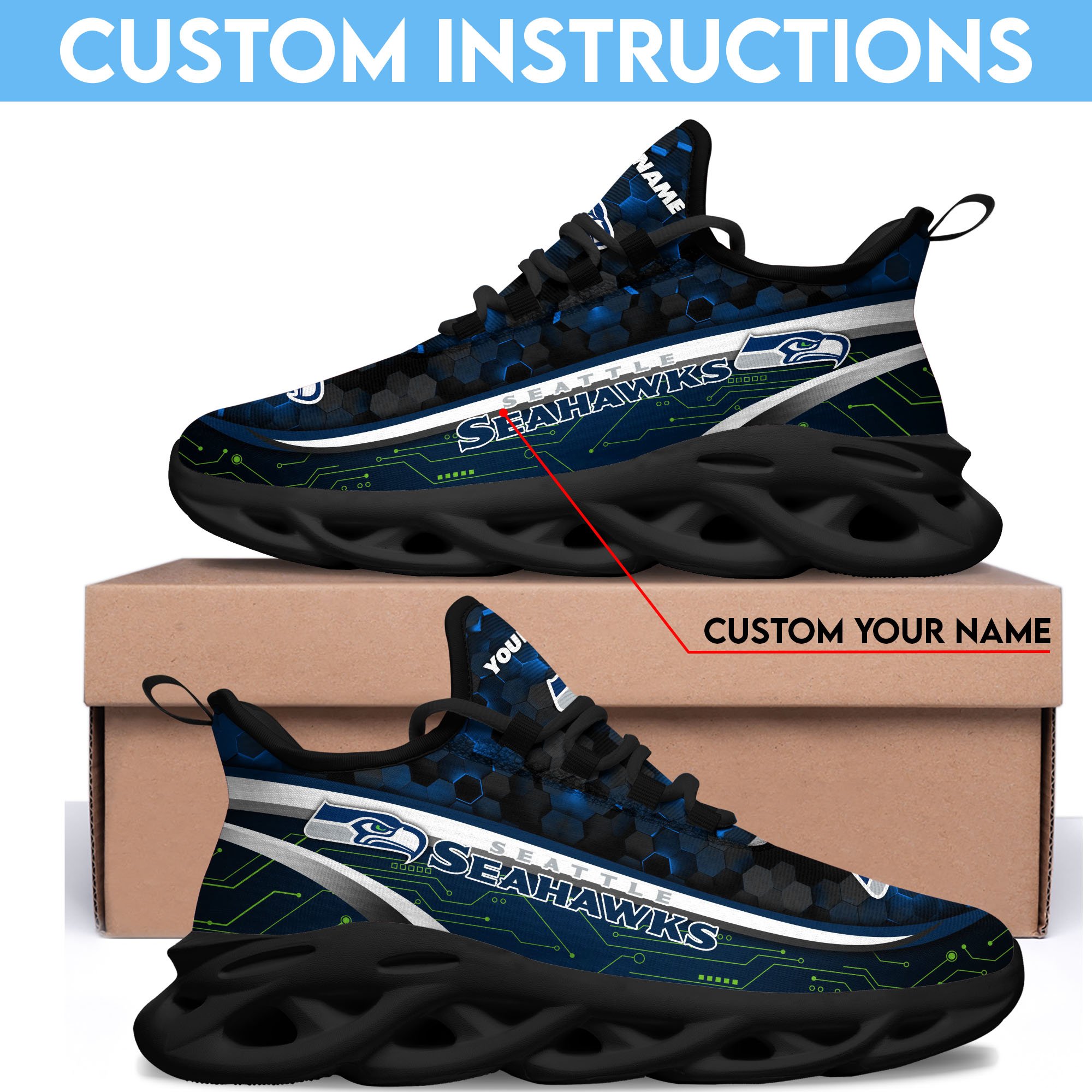 Seattle Seahawks Black Clunky Sneakers Custom Name, Max Soul Shoes, Sport Gifts