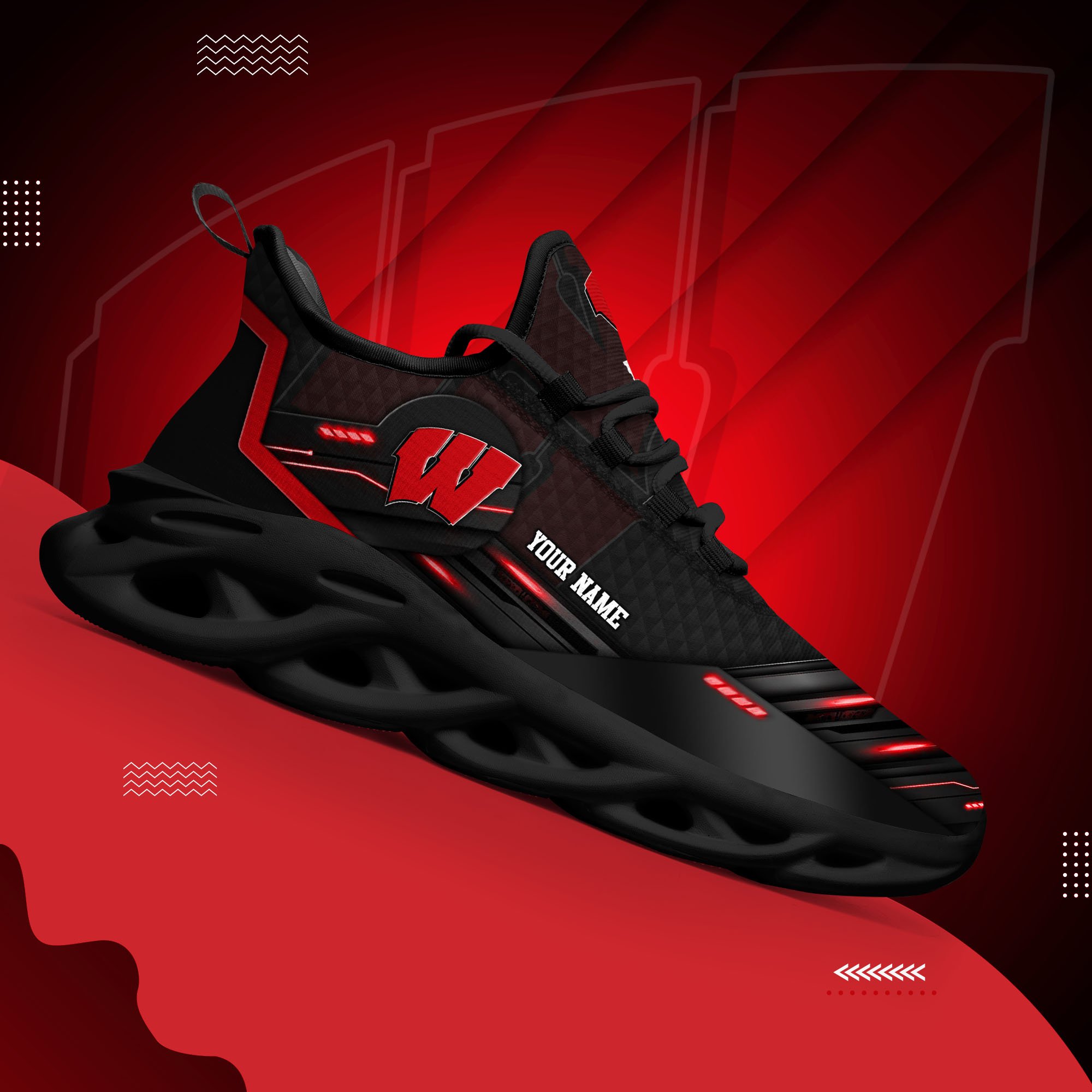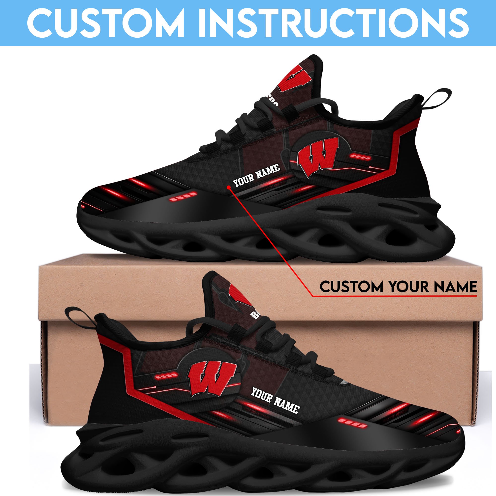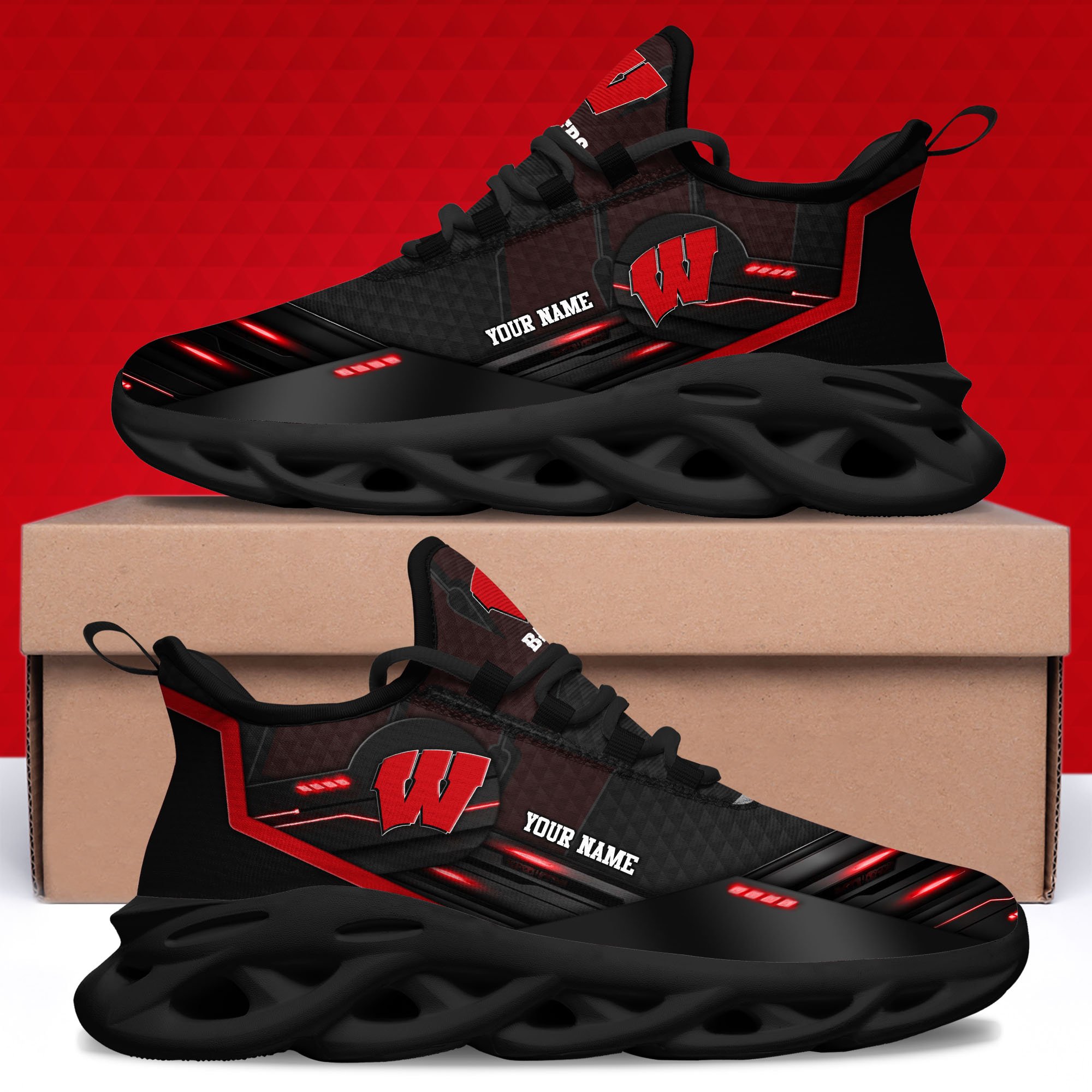 Wisconsin Badgers Black Clunky Sneaker Custom Name, Max Soul Shoes, Sport Gifts For Fan